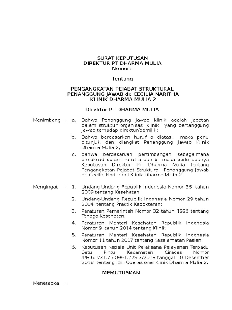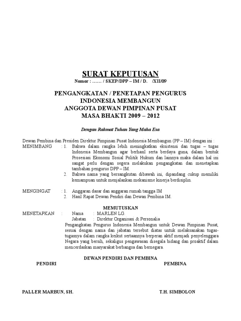 Contoh Sk Untuk Pengangkatan Bem from imgv2-2-f.scribdassets.com Surat keputusan pengangkatan pertama kali/ pengangkatan kembali dalam jabatan statistisi. Susunan / format surat keputusan pengangkatan karyawan tetap sangatlah penting, bagian terpenting adalah pencantuman tanggal pengangkatan, nama karyawan, nama pengangkat. Contoh surat keputusan pengangkatan karyawan tetap. Contoh surat pengangkatan jabatan di perusahaan kumpulan surat penting. Surat keputusan pengangkatan karyawan yang ditujukan untuk seseorang yang bisa menempati suatu jabatan marketing dalam pemasaran pada sebuah cv ataupun perusahaan yang diberi nama seperti cv. Atas dasar penilaian dan pengambilan kebijakan tertentu karyawan yang memiliki potensi dan linier keilmuan yang cukup membuat karyawan diangkat menduduki posisi yang lebih baik. Agar lebih jelas bagaimana bentuk format surat pengangkatan karyawan silahkan lihat pada contoh di bawah ini. Pengangkatan direktur operasional menimbang :